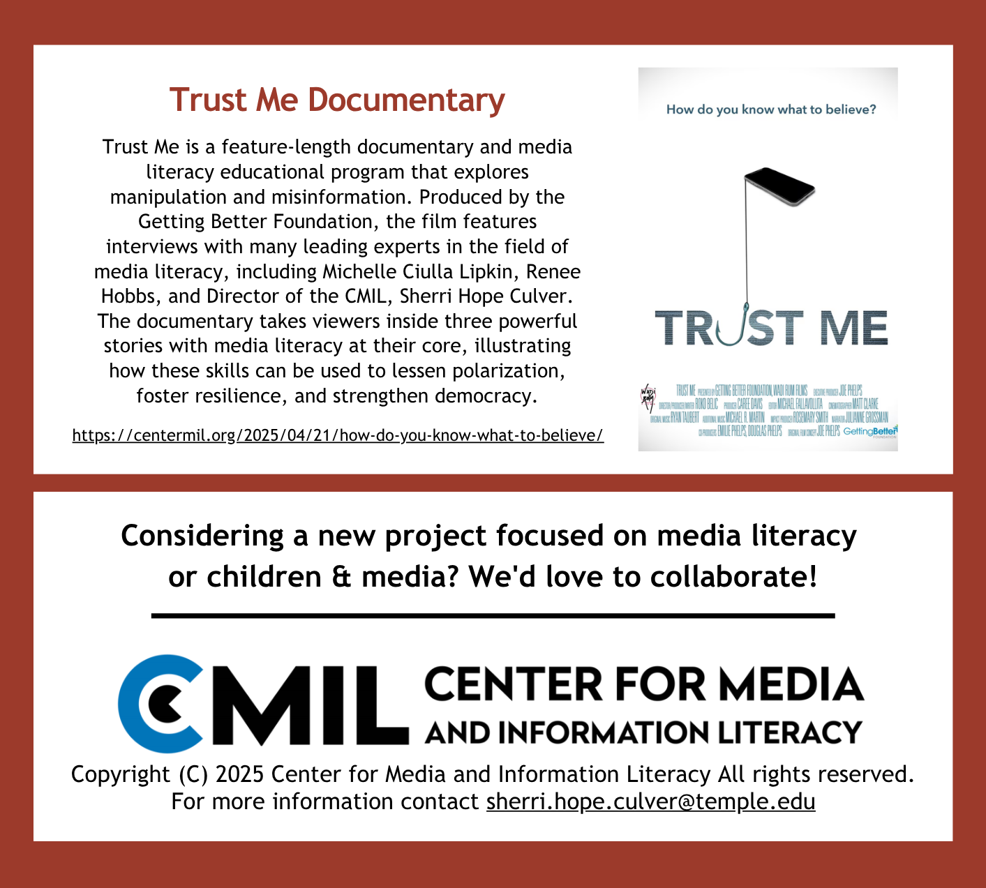 During UNESCO’s Global Media and Information Literacy (MIL) Week Feature Conference in Cartagena de Indias, Colombia, CMIL Director Sherri Hope Culver participated in two sessions that highlighted global progress in media literacy, AI education, and youth-centered cinema. The event brought together leaders from around the world to explore how media and information literacy continues to evolve in an increasingly complex digital environment…