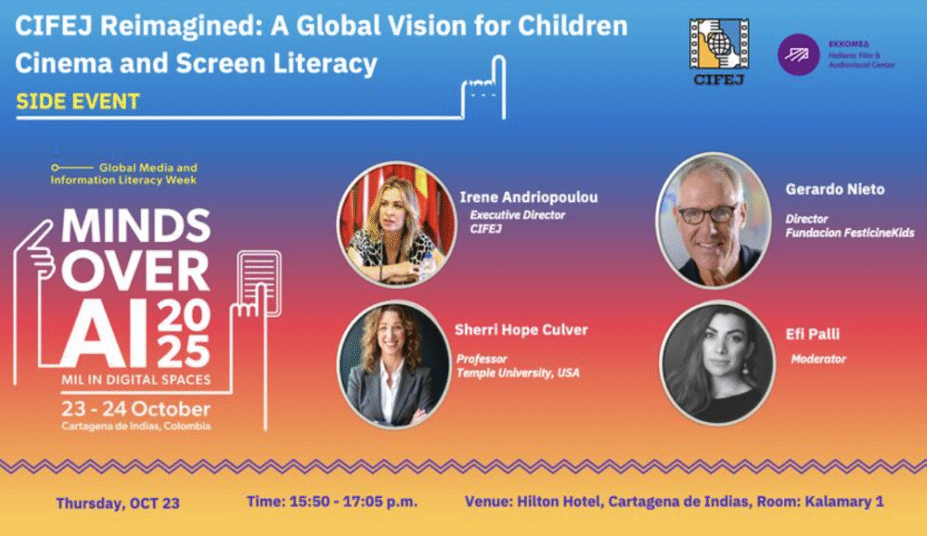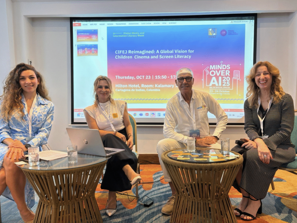Sherri also participated in a session celebrating the 70-year legacy of CIFEJ (International Centre of Films for Children and Young People), the UNESCO-founded organization dedicated since 1955 to children’s rights, media education, and global storytelling. The discussion highlighted CIFEJ’s ongoing mission and its renewed vision as it enters a new era headquartered in Greece. Joining fellow panelists Gerardo Neto, Director of Festicinekids in Colombia, and Efi Palli of the Hellenic Film and Audiovisual Center, who served as moderator, Sherri contributed insights from the CIFEJ Athens Symposium held in May 2025. She emphasized current initiatives and emerging opportunities aimed at strengthening creative learning and empowering young people through cinema.