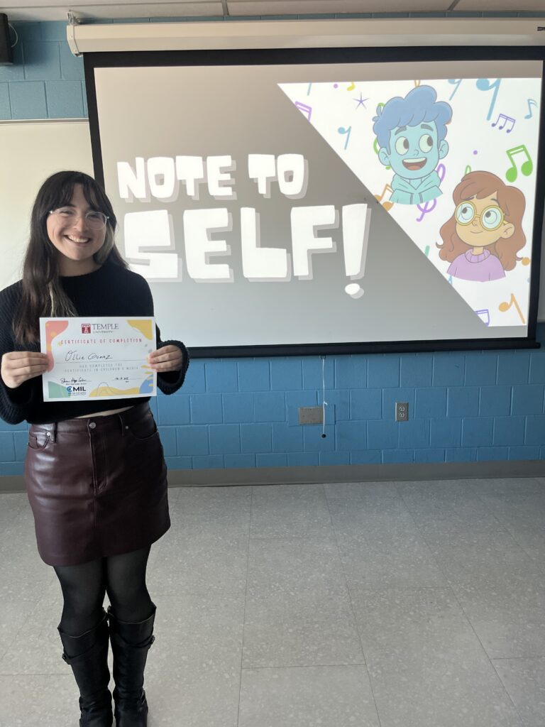 Ollie Gomez (MSP) presented her capstone on Note to Self!, an 11-episode animated comedy series for kids ages 10–12 that blends music, humor, and the unpredictable chaos of middle school. The series follows an awkward new cellist and a mischievous ghost pianist whose unlikely friendship shakes up Rhythm Ridge Middle School’s music wing. Ollie’s capstone showcases how animation and music can create fun, engaging stories that celebrate creativity, friendship, belonging, and a sense of community.