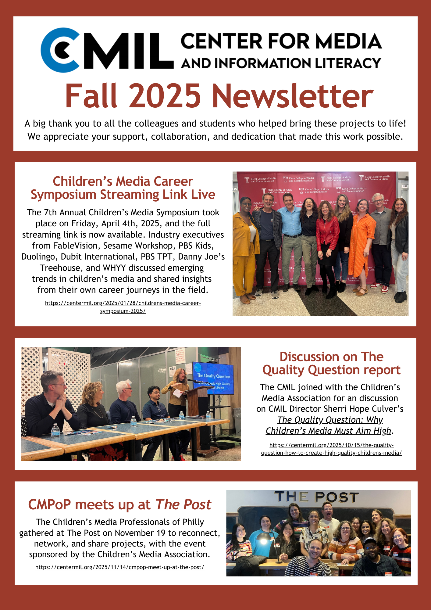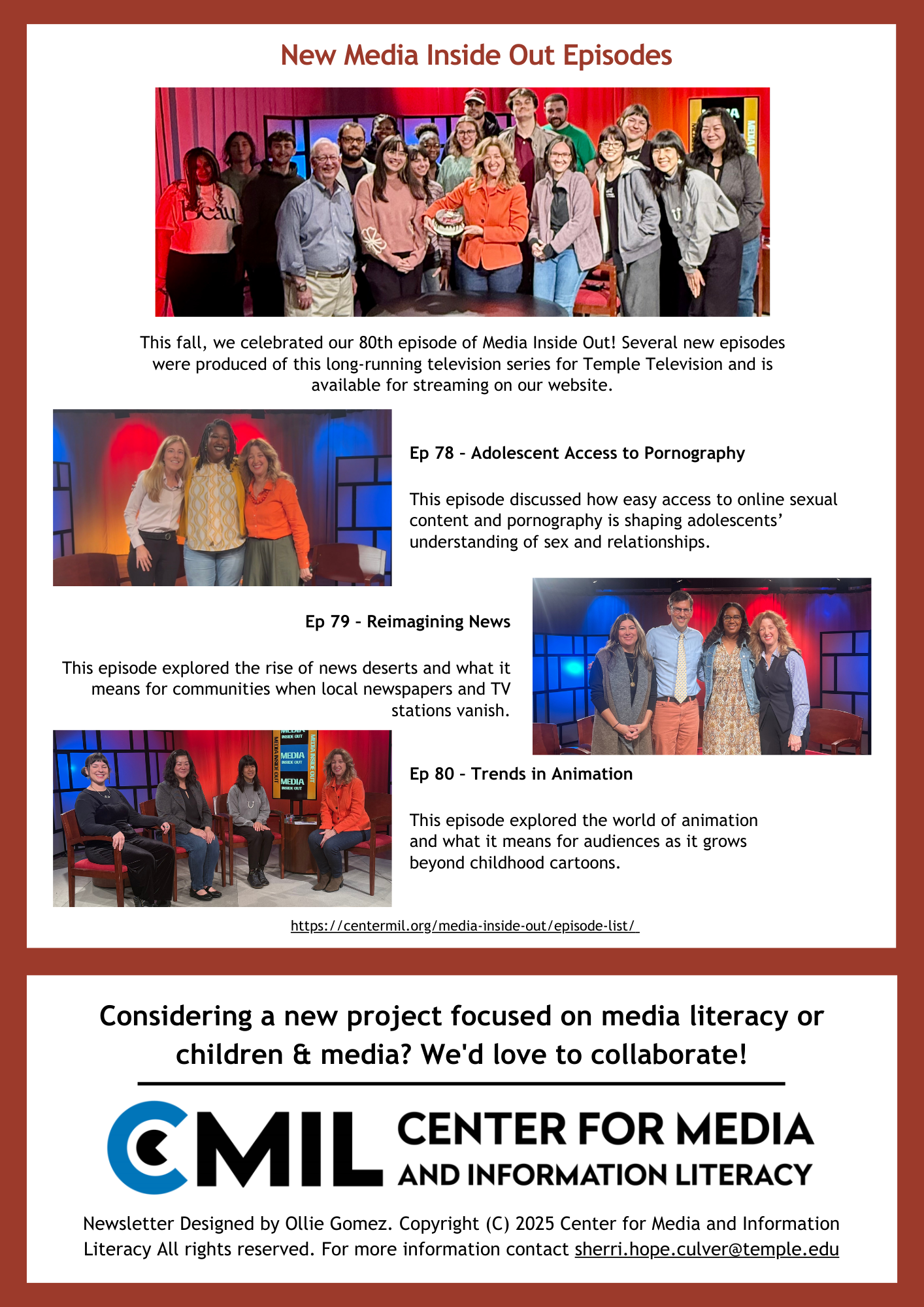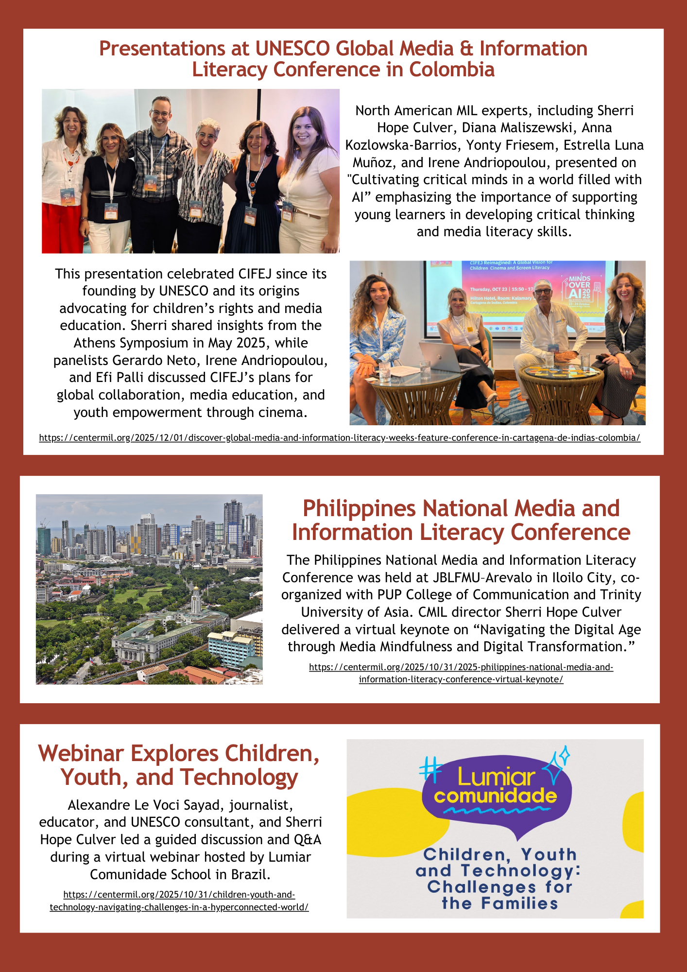 During UNESCO’s Global Media and Information Literacy (MIL) Week Feature Conference in Cartagena de Indias, Colombia, CMIL Director Sherri Hope Culver participated in two sessions that highlighted global progress in media literacy, AI education, and youth-centered cinema. The event brought together leaders from around the world to explore how media and information literacy continues to evolve in an increasingly complex digital environment…